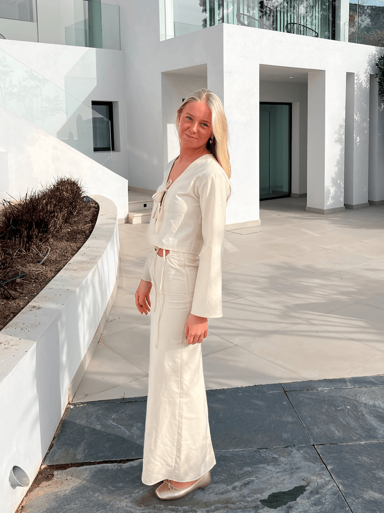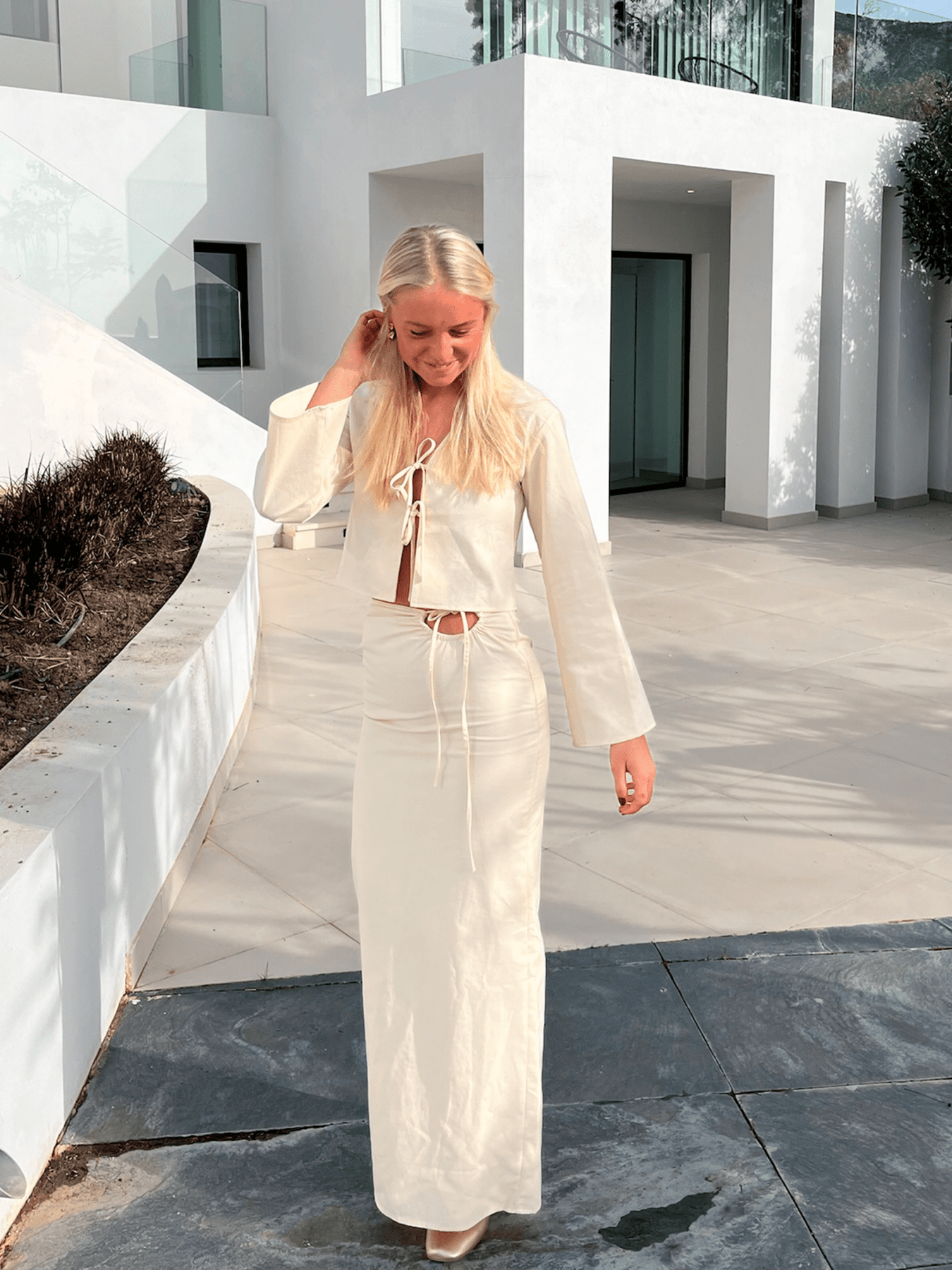 Kaunis hame nauhakiinnityksellä sivussa. Hameet on valmistettu pellavasekoitteesta, joka varmistaa, ettei se ole läpinäkyvä. Hameessa on halkio takana, ja se sopii täydellisesti Line Cardigan -neuletakin kanssa.