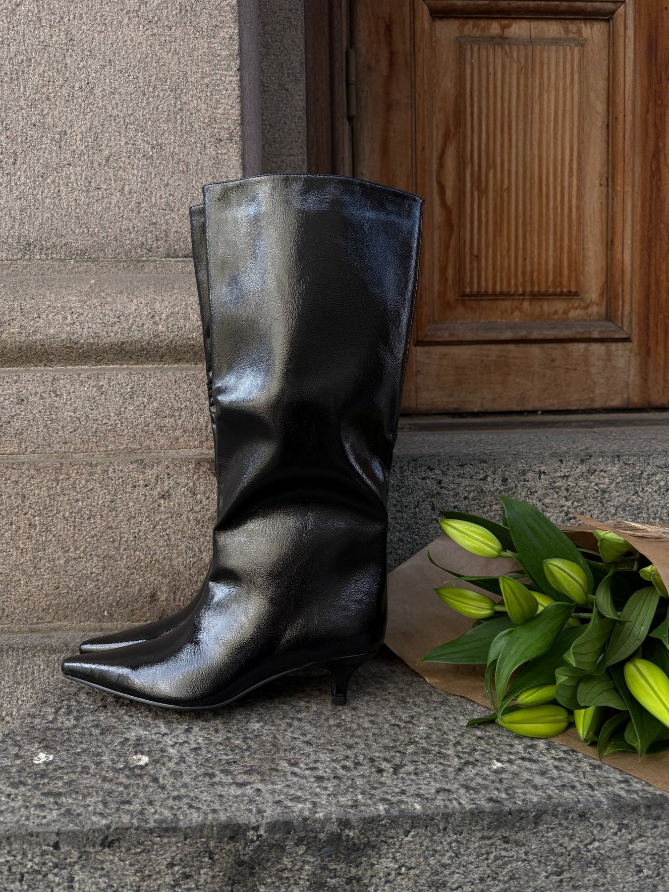 Madelaine Faux Leather Boots -saappaamme ovat tyylikkäät, polvipituiset saappaat, jotka on suunniteltu modernilla ilmeellä. Kiiltävä pinta antaa hienostuneen ilmeen, kun taas terävä kärki ja matala korko tuovat naisellista ilmettä.