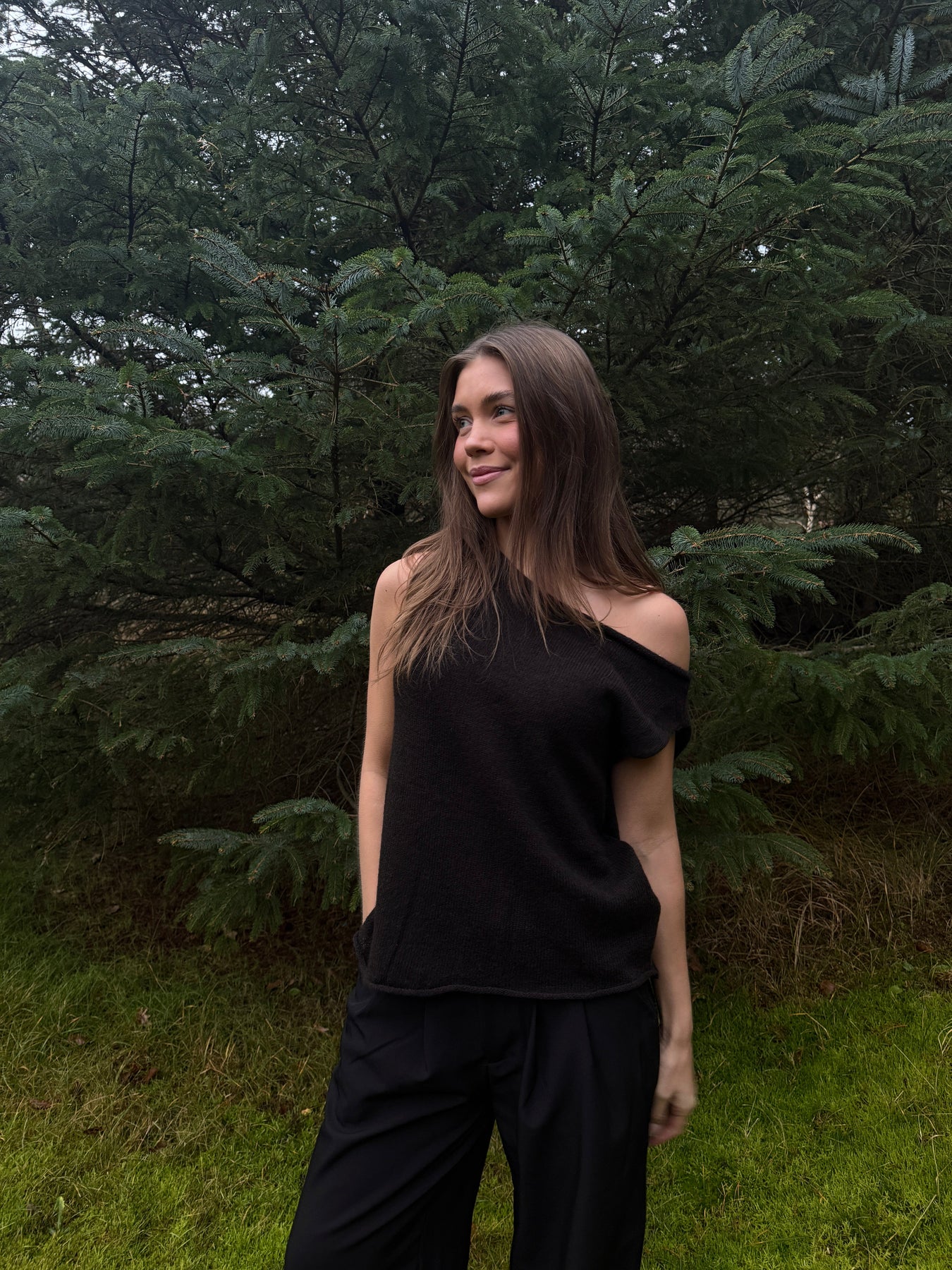 Creëer een moderne, moeiteloze look met deze asymmetrische gebreide top in een elegante donkerbruine tint. De zachte, licht rekbare kwaliteit flatteert het lichaam, terwijl het one-shoulder design een coole, verfijnde twist geeft aan je dagelijkse stijl.