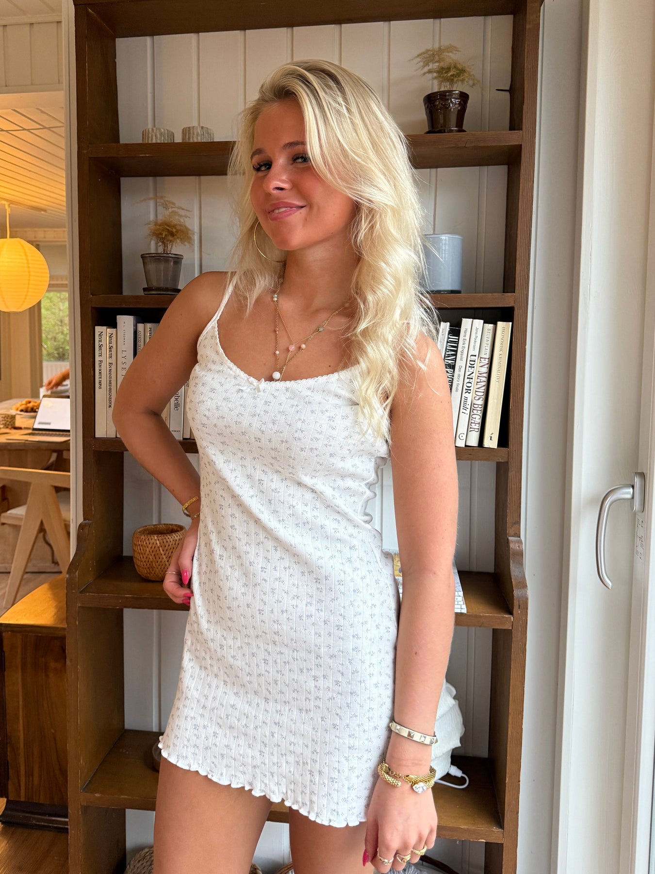 Deze prachtige mini-jurk combineert comfort en stijl in één. Gemaakt van een zachte stof met een subtiele textuur, accentueert hij het figuur op een natuurlijke en elegante manier. Dunne bandjes en een klein strikje aan de voorkant voegen een vrouwelijke en romantische touch toe, terwijl de licht gegolfde zoom een speelse afwerking creëert.
